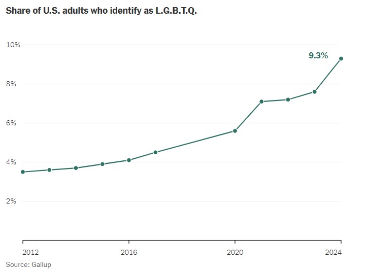 Στις ΗΠΑ, σχεδόν το 10% των ενηλίκων αναγνωρίζουν τον εαυτό τους ως ΛΟΑΤΚΙ, με την αύξηση αυτής της αναγνώρισης να είναι πιο έντονη τα τελευταία χρόνια. Η αλλαγή αυτή, κυρίως λόγω των νέων και των αμφιφυλόφιλων γυναικών, αντικατοπτρίζει μια βαθιά κοινωνική μεταβολή που επηρεάζει τις αντιλήψεις γύρω από τη σεξουαλικότητα και την ταυτότητα φύλου. Ωστόσο, ενώ η κοινωνική αποδοχή αυξάνεται, υπάρχουν και πολιτικές αντιστάσεις που ενδέχεται να ανατρέψουν αυτή την πρόοδο.