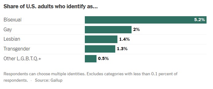 Σχεδόν το ένα τέταρτο των ενηλίκων στη γενιά Z, που σύμφωνα με τη Gallup είναι οι ηλικίες 18-27, αναγνωρίζουν τον εαυτό τους ως ΛΟΑΤΚΙ, σύμφωνα με την ανάλυση, η οποία περιλάμβανε 14.000 ενηλίκους σε όλες τις τηλεφωνικές έρευνες της Gallup πέρυσι. Περισσότεροι από τους μισούς από αυτούς τους ΛΟΑΤΚΙ νέους ενήλικες αναγνωρίζουν τον εαυτό τους ως αμφιφυλόφιλους.