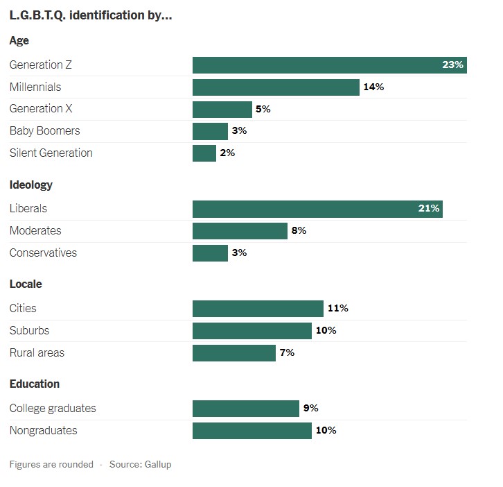 Αν και η αναγνώριση της ΛΟΑΤΚΙ ταυτότητας έχει αυξηθεί τα τελευταία χρόνια για όλες τις γενιές εκτός από τις πιο ηλικιωμένες, έχει αυξηθεί ταχύτερα μεταξύ των νέων. Κατά μέσο όρο, το 23% των ενηλίκων της γενιάς Z αναγνώρισαν τον εαυτό τους με αυτόν τον τρόπο τα τελευταία δύο χρόνια, από 19% την περίοδο 2020-2022.
