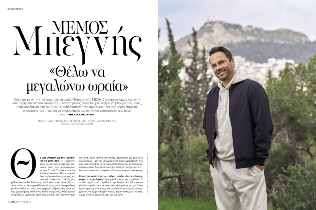 Ο Μέμος Μπεγνής επέστρεψε στην τηλεόραση με τη σειρά «Ταμπού» στο MEGA. Μας μιλάει για τον τρόπο που αντιμετωπίζει την καθημερινότητά του, τις σκέψεις του και μας αποκαλύπτει τις αποφάσεις που πήρε για να είναι σήμερα πιο υγιής και γοητευτικός από ποτέ.