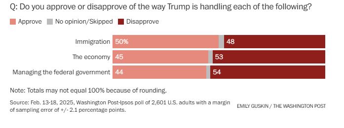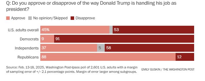 Συνολικά, η δημοσκόπηση της Post-Ipsos διαπιστώνει ότι το 45% των ενηλίκων εγκρίνει τον τρόπο με τον οποίο ο Τραμπ χειρίζεται τις υποθέσεις του, ενώ το 53% αποδοκιμάζει. Αυτό το καθαρό αρνητικό ποσοστό είναι χειρότερο από τα ευρήματα άλλων δημόσιων δημοσκοπήσεων.