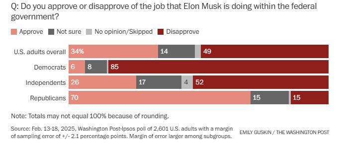 Οι Αμερικανοί αποδοκιμάζουν με αναλογία 2 προς 1 το γεγονός ότι ο Μασκ κλείνει ομοσπονδιακές υπηρεσίες που ο ίδιος κρίνει πως είναι περιττές και οι περισσότεροι (63%) ανησυχούν ότι η ομάδα του αποκτά πρόσβαση σε ευαίσθητα προσωπικά δεδομένα ατόμων.