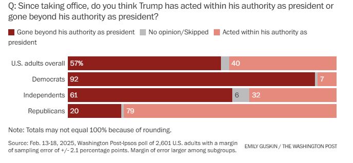 Στο ερώτημα, αν από την ανάληψη των καθηκόντων του ο Τραμπ ενήργησε εντός των αρμοδιοτήτων του ως πρόεδρος ή υπερέβη τις αρμοδιότητές του, το 57% απάντησε πως τις υπερέβη, ένα ποσοστό που γίνεται συντριπτικό μεταξύ όσων δηλώνουν ψηφοφόροι του Δημοκρατικού Κόμματος (92%), ακολουθούμενοι από εκείνους που δηλώνουν ανεξάρτητοι (61%), ενώ μόνο το 20% των Ρεπουμπλικανών τάσσονται υπέρ αυτής της άποψης.