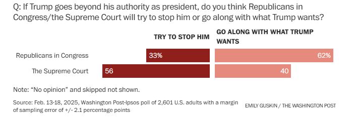 Η πλειοψηφία των Αμερικανών πιστεύει ότι το Ανώτατο Δικαστήριο θα προσπαθήσει να σταματήσει τον Τραμπ αν υπερβεί τις εξουσίες του, αλλά όταν ρωτήθηκε αν οι Ρεπουμπλικάνοι στο Κογκρέσο θα προσπαθήσουν να τον σταματήσουν αν συμβεί αυτό, η πλειοψηφία απάντησε πως οι Ρεπουμπλικάνοι νομοθέτες είναι πιθανό να συμφωνήσουν με αυτό που θέλει να κάνει ο Τραμπ.