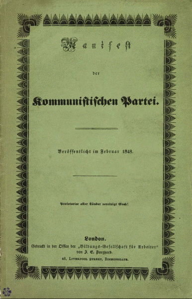 Το περίφημο Κομμουνιστικό Μανιφέστο (Μανιφέστο του Κομμουνιστικού Κόμματος), γέννημα του Καρόλου Μαρξ και του Φρίντριχ Ένγκελς, εκδόθηκε το Φεβρουάριο του 1848 (στις 21 του μηνός κατά τας γραφάς).