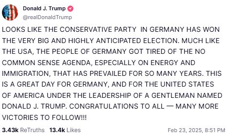 «Είναι μια μεγάλη μέρα για τη Γερμανία και για τις Ηνωμένες Πολιτείες της Αμερικής», χαιρέτισε ο Ρεπουμπλικάνος πρόεδρος στην πλατφόρμα του Truth Social, καθώς οι συντηρητικοί του Χριστιανοδημοκρατικού Κόμματος (CDU) και του συμμάχου τους της Βαυαρίας, της Χριστιανοκοινωνικής Ένωσης (CSU), λαμβάνουν ποσοστό σχεδόν 29%.