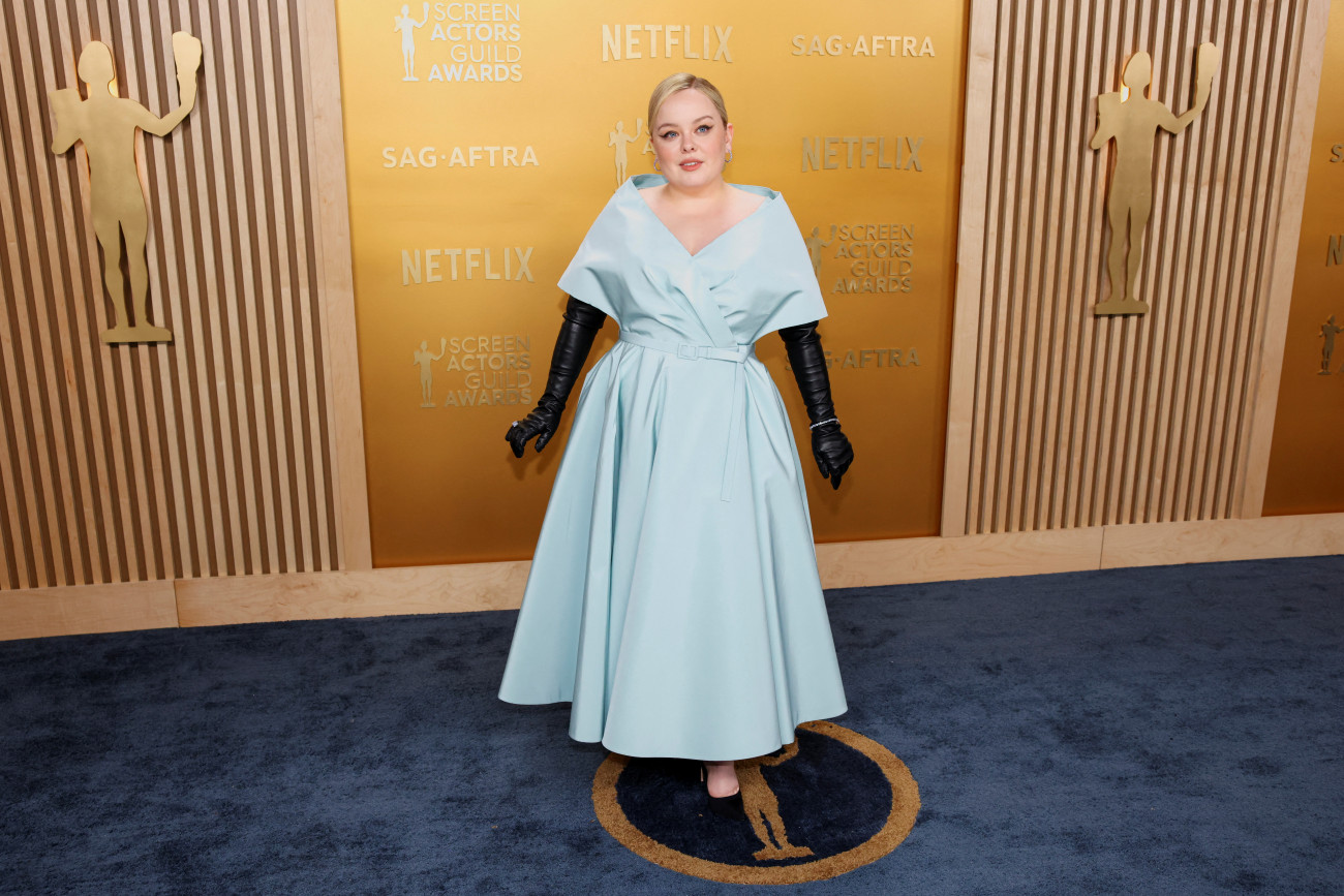 Η Νίκολα Κόκλαν με γαλάζιο Dior φόρεμά και ένα ζευγάρι μαύρα δερμάτινα γάντια | REUTERS/ Daniel Cole