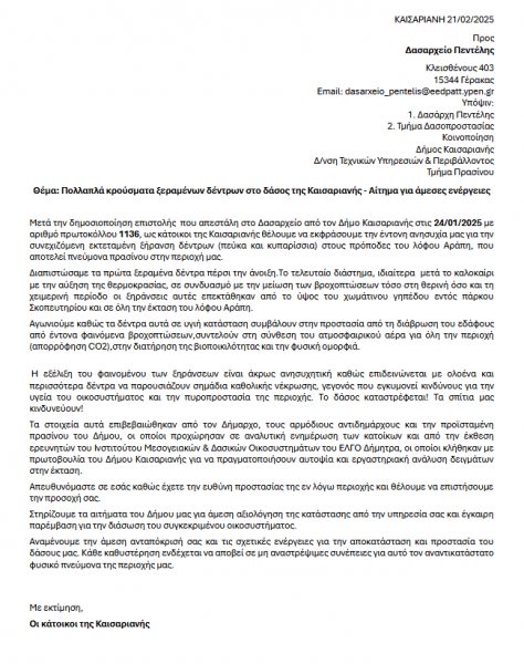 Ανησυχία προκαλεί στους κατοίκους της Καισαριανής η εκτεταμένη ξήρανση δέντρων στο δάσος της περιοχής, καθώς παρατηρούνται πολλά ξερά πεύκα και κυπαρίσσια στον λόφο Αράπη και το πάρκο Σκοπευτηρίου.