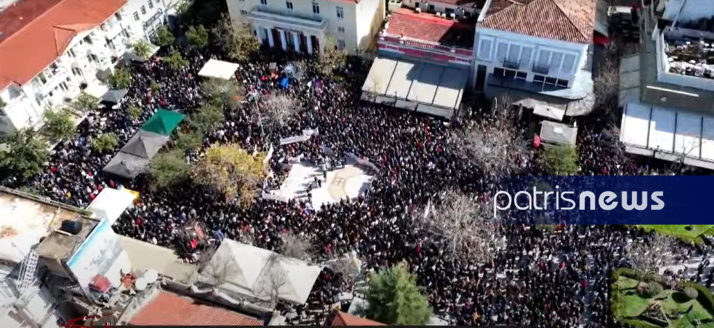 Μαζική και δυναμική συγκέντρωση πραγματοποιήθηκε σήμερα στην πλατεία Γεωργίου της Πάτρας, στη μνήμη των 57 νεκρών του σιδηροδρομικού δυστυχήματος στα Τέμπη.
