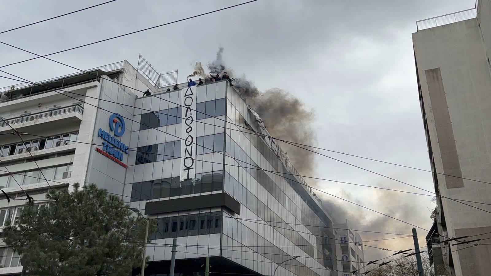 Πολίτες του κατέγραψαν επάνω στην ταράτσα του κτιρίου να κρεμάνε δύο τεράστια πανό, το ένα με την επιγραφή «δολοφόνοι» και το άλλο «μέχρι τέλους». Την ίδια στιγμή είχαν ανάψει καπνογόνα.