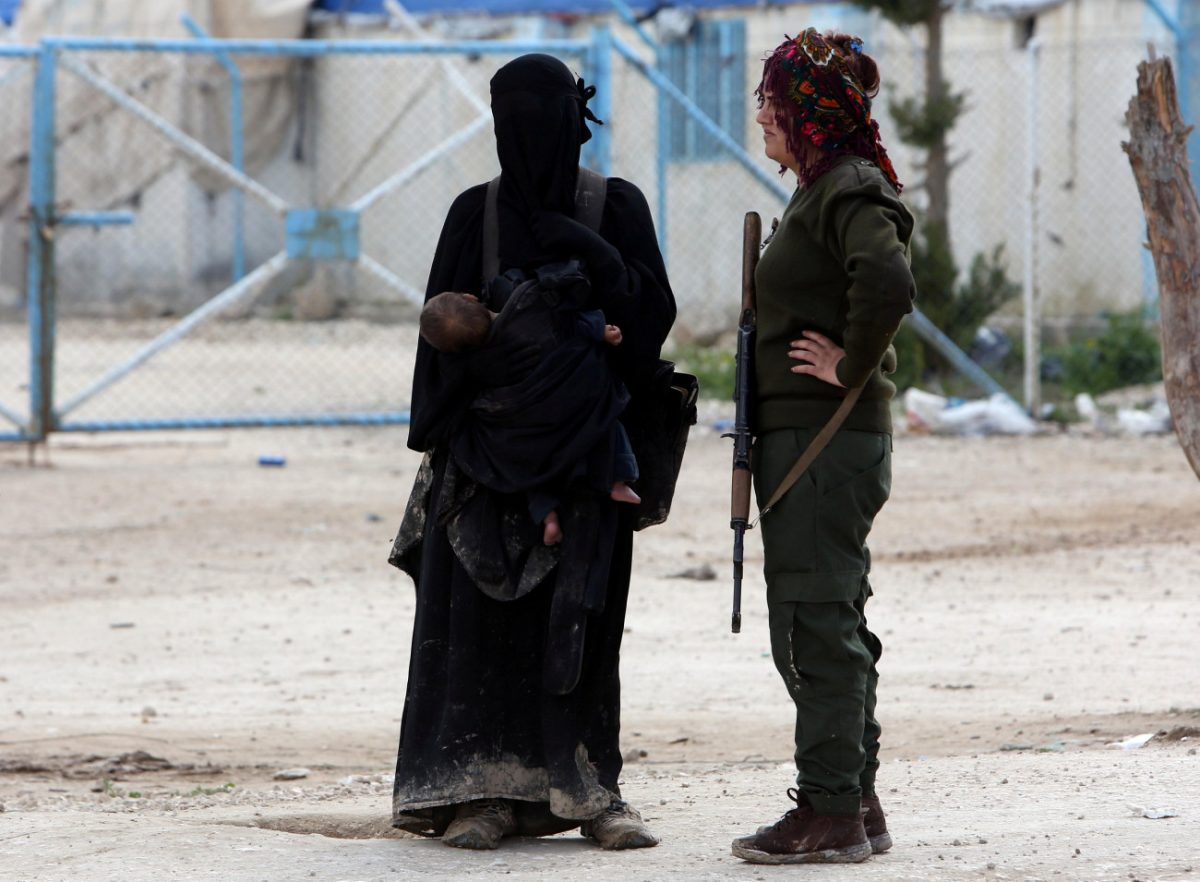 Μαχήτρια των κουρδο-αραβικών Συριακών Δημοκρατικών Δυνάμεων (SDF) στέκεται δίπλα στη σύζυγο ενός μαχητή του ISIS στο στρατόπεδο αλ-Χολ, στη βορειοανατολική Συρία (REUTERS/Ali Hashisho)