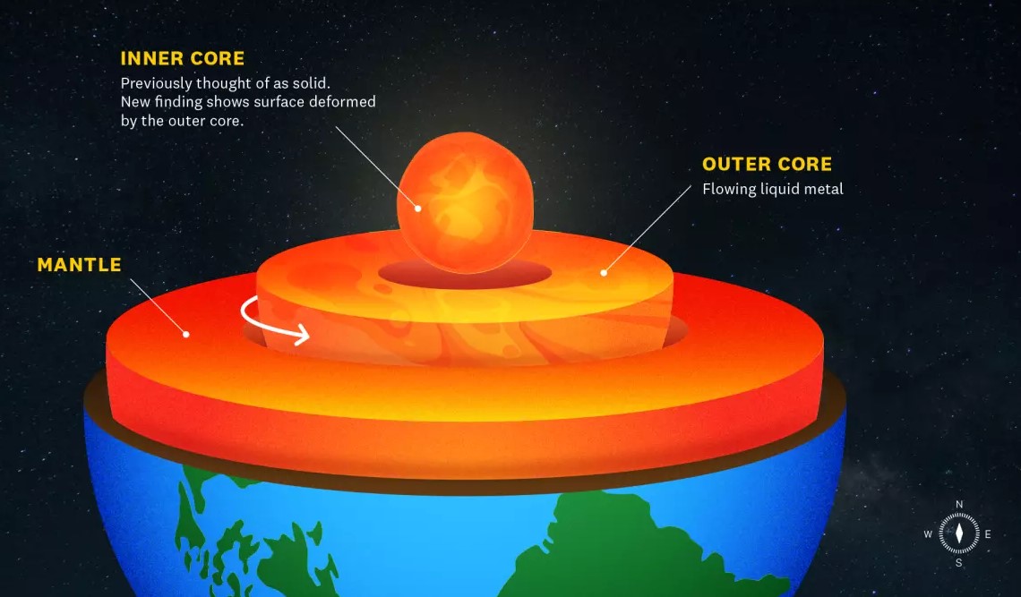 Ο εσωτερικός πυρήνας του πλανήτη θεωρούνταν προηγουμένως ως μια σκληρή, συμπαγής σφαίρα, αλλά η νέα μελέτη της επιστημονικής ομάδας του USC που δημοσιεύτηκε στο περιοδικό «Nature Geosciences» έδειξε ότι τα άκρα του είναι πιο μαλακά από ό,τι πίστευαν και στην πραγματικότητα αλλάζουν σχήμα.