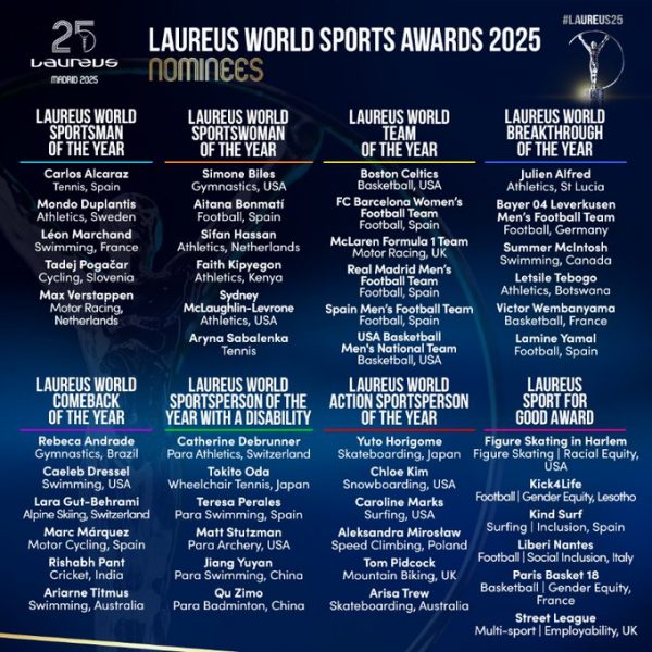 Το νο1 της παγκόσμιας κατάταξης της WTA βρίσκεται θα δώσει «μάχη» με σπουδαία ονόματα του αθλητισμού, όπως οι Σίμον Μπάιλς, Αϊτάνα Μπονμάτι, Σιφάν Χασάν, Φέιθ Κιπιεγκόν και Σίντεϊ ΜακΛογκλιν-Λεβρόν. Από την άλλη ο Ισπανός τενίστας είναι υποψήφιος για τον τίτλο του κορυφαίου αθλητή της χρονιάς μαζί με τους Μόντο Ντουμπλάντις, Λέον Μαρσάντ, Ταντέι Πόγκατσαρ και Μαξ Φερστάπεν.