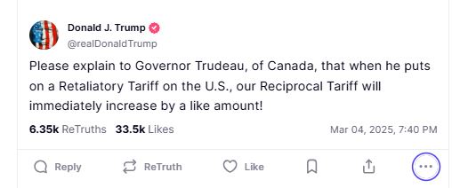Ο Καναδός πρωθυπουργός Τζάστιν Τριντό ανακοίνωσε δασμούς 25% σε αμερικανικά προϊόντα αξίας 155 δισεκατομμυρίων δολαρίων Καναδά (107 δισεκατομμυρίων δολαρίων) σε αντίποινα, ξεκινώντας με 30 δισεκατομμύρια δολάρια αμέσως και τα υπόλοιπα 125 δισεκατομμύρια δολάρια εντός 21 ημερών.