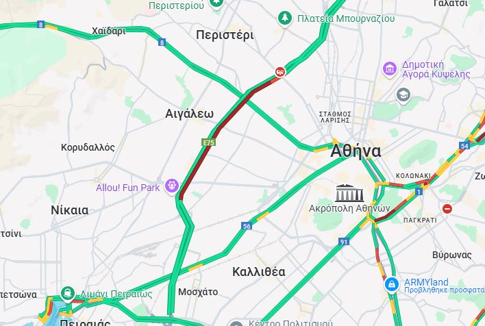 Όπως φαίνεται και στον χάρτη, τα οχήματα σχηματίζουν ουρές χιλιομέτρων και το μποτιλιάρισμα ξεκινά από την περιοχή του Ρέντη.