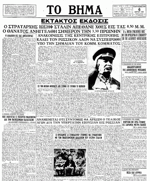 *Κείμενο του πρύτανη του χρονογραφήματος, του ασύγκριτου Παύλου Παλαιολόγου, που έφερε τον τίτλο «Μαθήματα από το θάνατο» και είχε δημοσιευτεί στην εφημερίδα «Το Βήμα» στις 6 Μαρτίου 1953, την επαύριον του θανάτου του κραταιού ηγέτη της ΕΣΣΔ, στρατάρχη Ιωσήφ Στάλιν. Ο Στάλιν είχε αποβιώσει στη Μόσχα στις 8:50 μ.μ. (ώρα Ελλάδας) της 5ης Μαρτίου 1953.