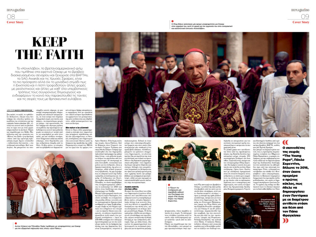 Το εξώφυλλο του περιοδικού BHMAGAZINO φιλοξενεί τους κορυφαίους stars οι οποίοι μαζί με διάσημους σκηνοθέτες, μουσικούς, fashion designers, άντλησαν έμπνευση από την θρησκεία για να δημιουργήσουν εμβληματικές κινηματογραφικές και τηλεοπτικές παραγωγές. Τζουντ Λο, Ρέϊφ Φάινς, Τζον Μάλκοβιτς, Τομ Χανκς, Άντονι Χόπκινς, Τζόναθαν Πράϊς, έγραψαν τις δικές τους χρυσές σελίδες στον χώρο του παγκόσμιου θεάματος, πριν φθάσουν στα Oscars.