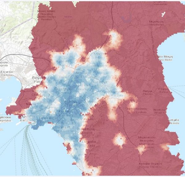 Με μπλε οι περιοχές της Αθήνας που μπορεί ο πεζός να φτάσει σε 15 λεπτά σε βασικές υπηρεσίες πηγή: Sony CSL