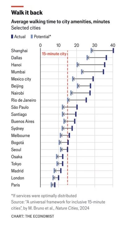 Διαπίστωσαν ότι με μια μικρής κλίμακας αστική αναδιάταξη, θα μπορούσε να μειωθεί κατά δύο λεπτά ο μέσος χρόνος περπατήματος και το 97% των ανθρώπων θα μπορούσε να ζει σε γειτονιές 15 λεπτών. Αυτό δείχνει πώς ο πολεοδομικός σχεδιασμός θα μπορούσε να βελτιώσει τη «βαδισιμότητα» μιας πόλης, όμως δεν περιλαμβάνει την οικονομική διάσταση. Για να δημιουργηθούν περισσότερες βασικές υπηρεσίες και υποδομές σε λιγότερο κεντρικές περιοχές, θα χρειάζονταν να δοθκίνητρα από τις κυβερνήσεις, υπογραμμίζει ο Εconomist.