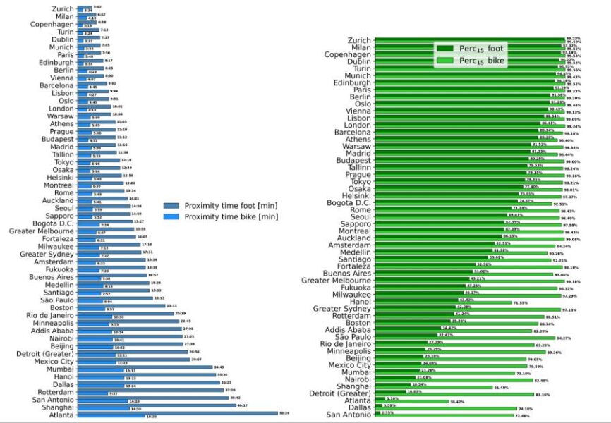 Οι ερευνητές εφάρμοσαν την ίδια «αλγοριθμική» φόρμουλα σε άλλες 53 πόλεις. Από αυτές οι 34 ήταν ήδη «πόλεις των 15 λεπτών» για τους περισσότερους κατοίκους, ενώ άλλες δέκα είχαν την δυνατότητα να γίνουν.