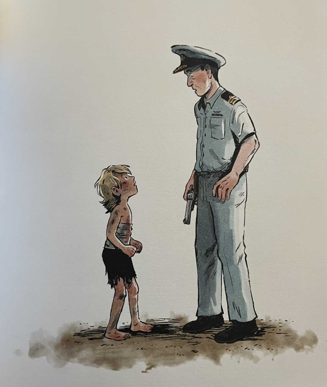 Η εικονογράφος ήξερε, λοιπόν, τι είχε να αντιμετωπίσει για να μετατρέψει το μυθιστόρημα σε graphic novel: την ιστορία μίας ομάδας αγοριών που επιβιώνουν σε ένα τροπικό ακατοίκητο νησί ύστερα από την πτώση ενός αεροπλάνου. Θα πρέπει να οργανωθούν, να εκλέξουν αρχηγό, να καταπιέσουν ένστικτα, να φέρουν στην επιφάνεια κάποια άλλα, να κοιτάξουν τον φόβο μέσα στη νύχτα. Και καθώς η αγέλη παίρνει τη θέση της ομάδας, κάνει την εμφάνισή της η βία μέχρι που αυτά -τα αθώα παιδιά- επιστρέφουν στις απαρχές της αρχαϊκής κοινότητας. Ο Σάιμον, που θα αντικρίσει το κομμένο κεφάλι του αγριογούρουνου, το οποίο ο Τζακ έχει καρφώσει σε ένα ραβδί -θυσία στο άγνωστο «θηρίο» του νησιού- είναι και ο πρώτος που θα εκτεθεί στη βία συνομιλώντας μέσα στις παραισθήσεις του με τον «Άρχοντα των μυγών». Είναι από τις φράσεις του πρωτότυπου που η εικονογράφος δεν χρησιμοποιεί, αλλά υπονοείται παντού στα πολύ δυνατά καρέ του επεισοδίου: «Τα μισόκλειστα μάτια της γουρουνοκεφαλής ήταν σκοτεινιασμένα από τον άπειρο κυνισμό της ενήλικης ζωής. Διαβεβαίωναν τον Σάιμον ότι τα πάντα ήταν μια άσχημη υπόθεση». Αντιθέτως, λίγο πριν από το τέλος, θα κρατήσει ατόφια την αντίδραση του Ραλφ, του πρώτου αρχηγού που εκλέγουν τα παιδιά: «Τα δάκρυα κύλησαν κι οι λυγμοί τον τράνταξαν… Αφέθηκε, και δυνατοί σπασμοί θλίψης τον τράνταξαν, έτοιμοι θαρρείς να τον διαλύσουν… Θρήνησε για το τέλος της αθωότητας, τον ζόφο της ανθρώπινης καρδιάς, και τον χαμό ενός αληθινού, σοφού φίλου που τον έλεγαν Πίγκι».