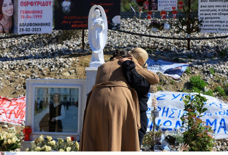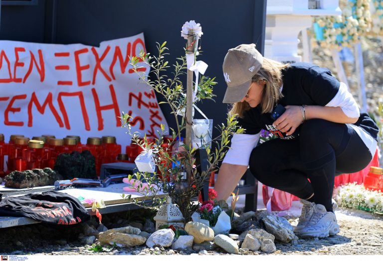 Πατέρας με παιδί μπροστά σε ένα πορτρέτο των αδικοχαμένων διδύμων και της ξαδέλφης τους που επέβαιναν στο μοιραίο τρένο