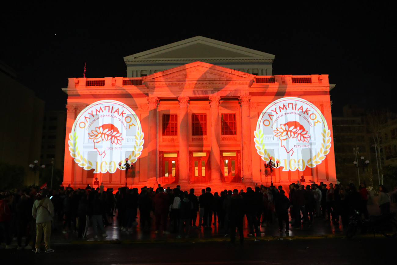 Περιμένοντας να φτάσει μεσάνυχτα και μαζί (τυπικά) τα 100 γενέθλια του Ολυμπιακού, ο Πειραιάς φοράει τα καλά του και μετρά αντίστροφα. Η εικόνα στο Δημοτικό Θέατρο μάλιστα τα λέει όλα.