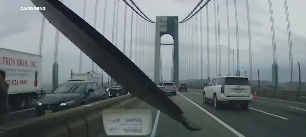 Η ξύλινη σανίδα εκτοξεύτηκε από ένα φορτηγό λόγω του ισχυρού αέρα που έπνεε σε κρεμαστή γέφυρα στη Νέα Υόρκη. Ο οδηγός συνέχισε την πορεία του μέχρι να βρει ασφαλές σημείο και να σταματήσει.
