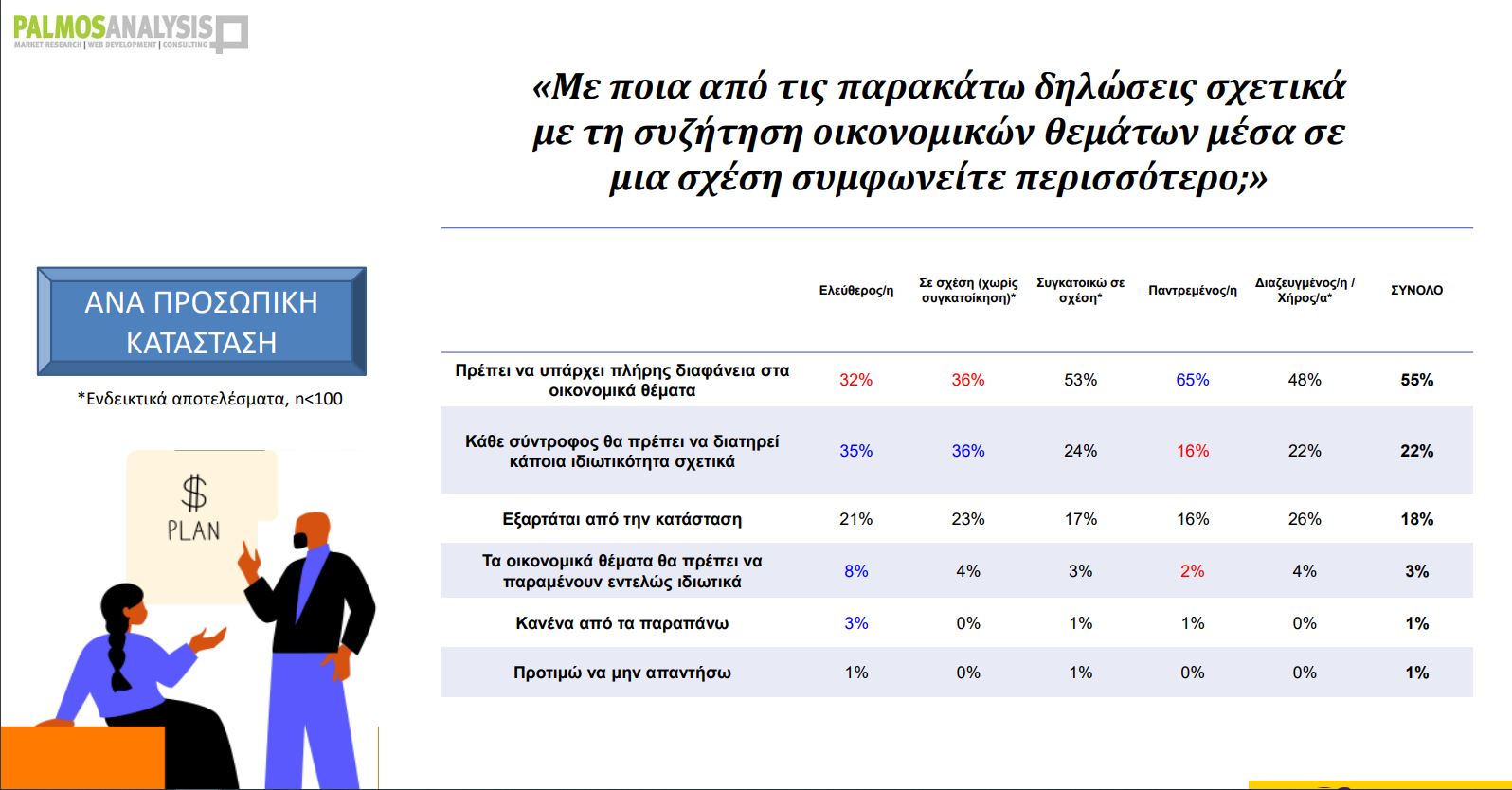 Στην Ελλάδα πάντως, ιδίως τα νεότερα ζευγάρια πιστεύουν περισσότερο στην οικονομική αυτονομία του καθενός παρά στην πλήρη οικονομική διαφάνεια. Όπως έδειξε δημοσκόπηση της Palmos Analysis και της fintech εταιρείας Plum, μόνο ο ένας στους δύο χρησιμοποιεί κοινό τραπεζικό λογαριασμό με τον/την σύντροφό του, έστω για κάποια έξοδα. Επίσης ενώ οι δύο στους τρεις παντρεμένους πιστεύουν ότι πρέπει να υπάρχει διαφάνεια στα οικονομικά θέματα σε μια σχέση, οι υπόλοιποι είτε πράττουν κατά περίσταση, είτε κρατάνε κάποια ή όλα τα οικονομικά θέματα ιδιωτικά.