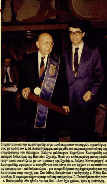 Μ’ αυτά και άλλα παρόμοια, την επομένη της ανακήρυξής του σε επίτιμο διδάκτορα της Παντείου, ο κ. Καστοριάδης διασκέδασε τους ακροατές του στο Βόλο, προκαλώντας ανακουφιστικά «χάχανα». Να λοιπόν τι θα πει απαρεμφατικός φιλοσοφικός λόγος, αρχαιολατρικό ήθος, συμφωνία του ελληνικού Άγαν και του ασιατικού Αγά, που ο θεός τον προόρισε να σφάζει και να δέρνει, για να μας εξαγιάσει. Μαθαίνω πως, μετά από το κοπιώδες έργο του, ο Καστοριάδης κάνει διακοπές στην Κρήτη. Καλή ξεκούραση.