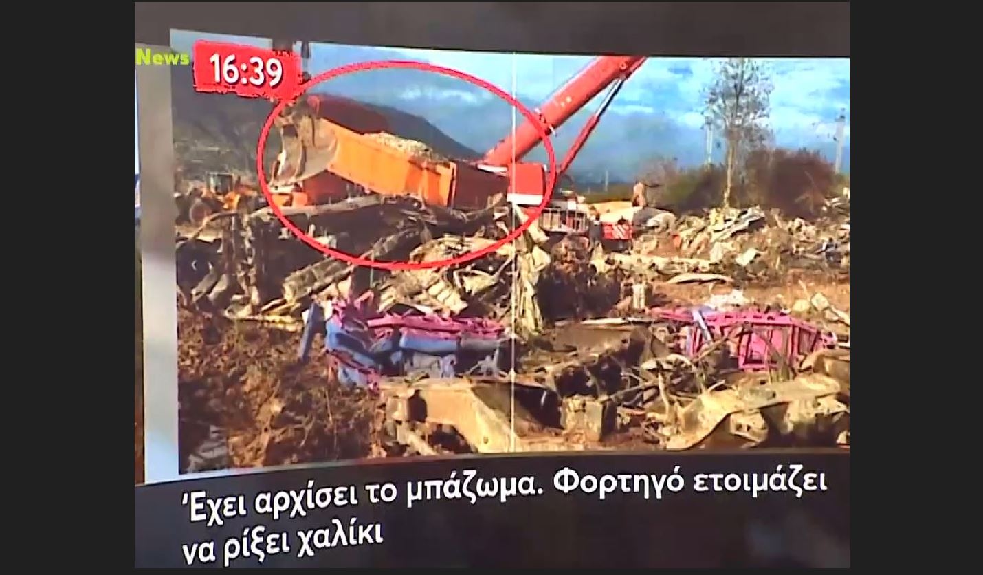 -Την Πέμπτη 2 Μαρτίου 2023 τα ίδια μηχανήματα απομακρύνουν συντρίμμια ακόμη και την ώρα περισυλλογής σορών.