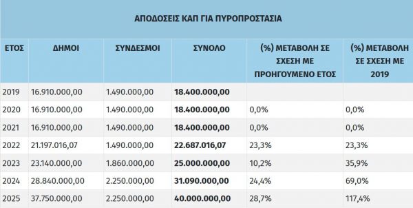 Η σημερινή ανακοίνωση του Υπουργείου Εσωτερικών που επιβεβαιώνει πλήρως το ρεπορτάζ αναφέρει: «Χρηματοδότηση ύψους 40 εκ. ευρώ, αυξημένη κατά 9 εκ. ευρώ (28,6%) σε σχέση με το 2024, διατίθεται από το Υπουργείο Εσωτερικών προς τους Δήμους και τους Συνδέσμους τους για την υλοποίηση δράσεων πυροπροστασίας το 2025.