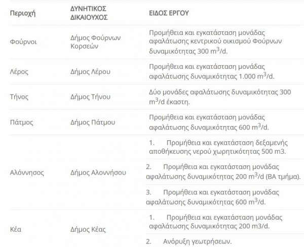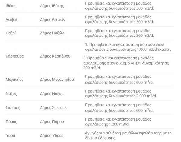 Η επιλογή των πρώτων 19 δυνητικών δικαιούχων έγινε, κατόπιν συνεργασίας του Γενικού Γραμματέα Φυσικού Περιβάλλοντος και Υδάτων, κ. Πέτρου Βαρελίδη με τον Γενικό Γραμματέα Αιγαίου και Νησιωτικής Πολιτικής, κ. Μανώλη Κουτουλάκη, με βασικό κριτήριο την αναγκαιότητα που παρουσιάζεται στους συγκεκριμένους δήμους για άμεση λήψη μέτρων αντιμετώπισης της λειψυδρίας.