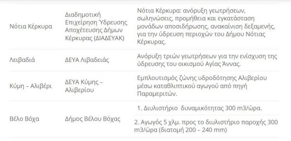 Μεταξύ άλλων, τα έργα που προτεραιοποιούνται αφορούν σε: προμήθεια και εγκατάσταση μονάδων αφαλάτωσης, γεωτρήσεις για την ενίσχυση της ύδρευσης, εμπλουτισμό ζώνης υδροδότησης μέσω αγωγών, κ.ά.