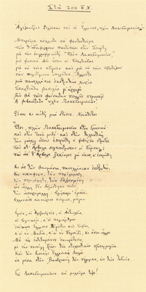 Έτσι, πλην Λακεδαιμονίων στον Γρανικό· και στην Ισσό μετά· και στην τελειωτική την μάχη όπου εσαρώθη ο φοβερός στρατός που στ’ Άρβηλα συγκέντρωσαν οι Πέρσαι: που απ’ τ’ Άρβηλα ξεκίνησε για νίκην, κ’ εσαρώθη.