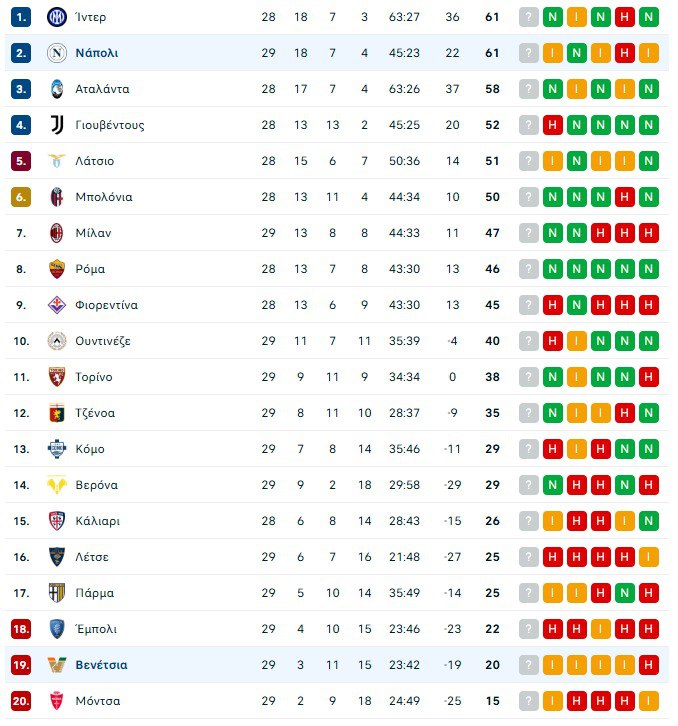 Από την άλλη, η ομάδα της Βενετίας, συνεχίζει να βρίσκεται στην επικίνδυνη ζώνη, όντας 19η, με 20 βαθμούς.