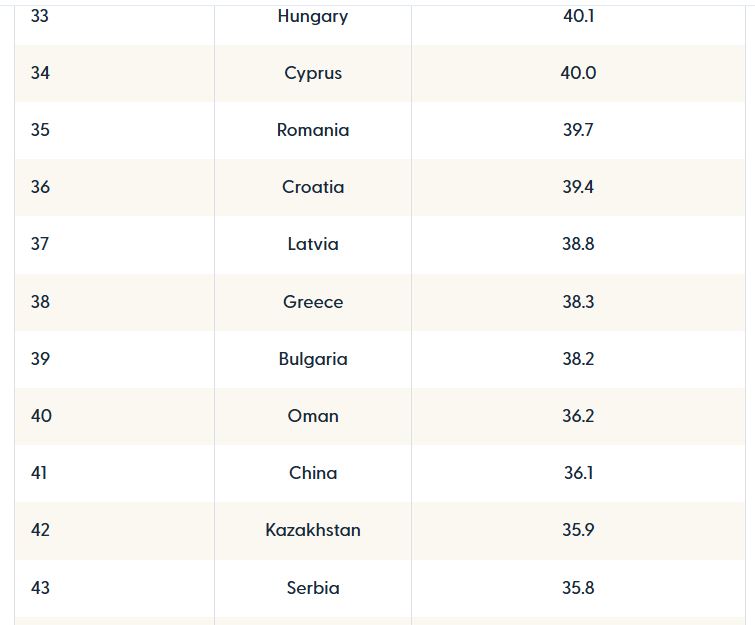 Για την ιστορία η Ελλάδα είναι στην 38η θέση, με συνολική βαθμολογία 38,3 στα 100. Βρίσκεται μόλις μια μονάδα πάνω από τη Βουλγαρία (38,2) και κάτω από τη Λετονία, που συγκεντρώνει 38,8 μονάδες. Πρόκειται για τη χαμηλότερη βαθμολογία από όλες τις χώρες της ΕΕ που συμμετέχουν στη λίστα, με εξαίρεση τη Μάλτα που βρίσκεται ακόμα πιο χαμηλά, στην 44η θέση.