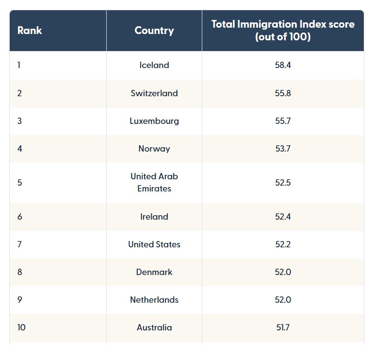 Η Ισλανδία ανακηρύσσεται «βασίλισσα» στη λίστα με τις καλύτερες χώρες για μετανάστευση, με συνολικό σκορ 58,4 στα 100. Η πρωτιά κερδήθηκε χάρη στις υψηλές επιδόσεις σε μια σειρά τομείς: Την πρόσβαση σε τραπεζικές υπηρεσίες, τα επίπεδα ευτυχίας, τη συνδεσιμότητα και τα επίπεδα ασφάλειας.