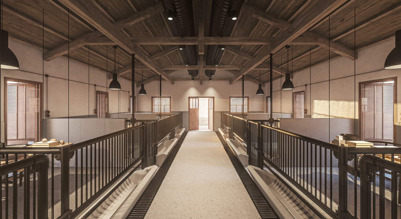 Με σεβασμό στη βιομηχανική αρχιτεκτονική του κτηρίου γίνονται οι αναγκαίες μετασκευές, ώστε να εξυπηρετηθεί η νέα χρήση. Για παράδειγμα, οι ταΐστρες και τα κιγκλιδώματα στους χώρους σταυλισμού διατηρούνται και χρησιμοποιούνται ως σημεία πώλησης.