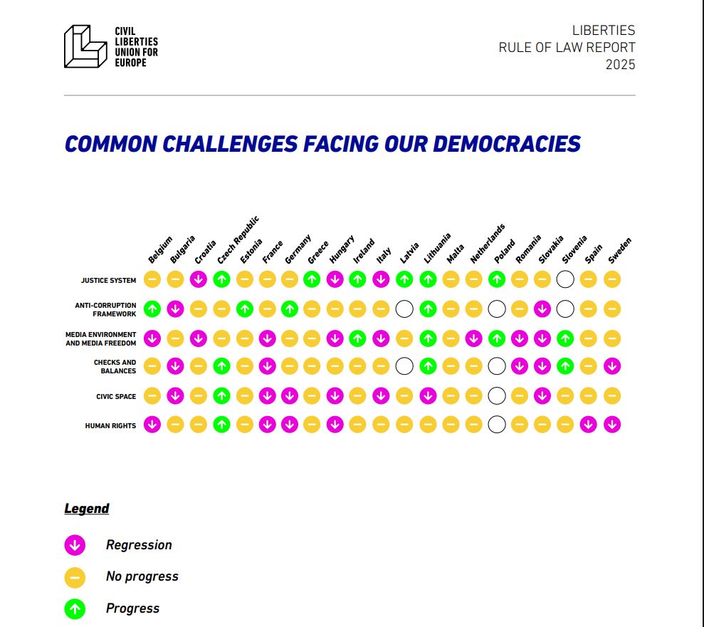 Η έκθεση για το κράτος δικαίου που δημοσιεύεται από την Ένωση Πολιτικών Ελευθεριών για την Ευρώπη αποτελεί ηχηρό «καμπανάκι» για όλη την Ευρώπη. Συστημικές ελλείψεις σε όλο το μπλοκ και στασιμότητα της Ελλάδας στη βελτίωση κρίσιμων δεικτών.