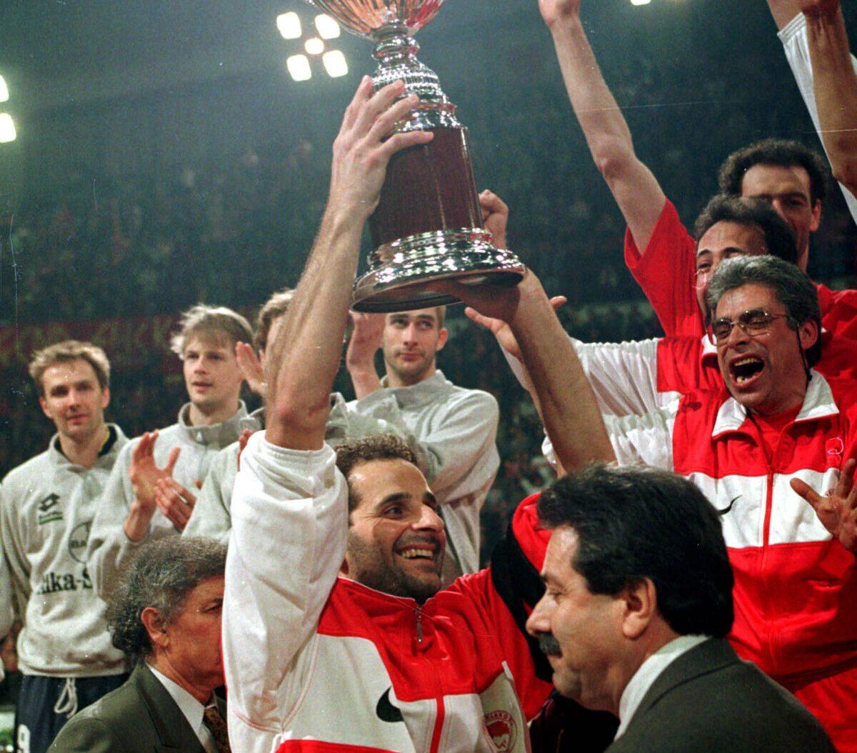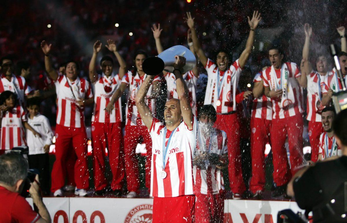 Holding the 2023 champion’s trophy. The captain keeps on adding to his trophy collection and leading Olympiacos to new heights.