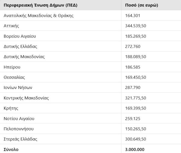 - 3.000.000 ευρώ προς τις 13 Περιφερειακές Ενώσεις Δήμων (ΠΕΔ) της χώρας, με την εξής κατανομή: