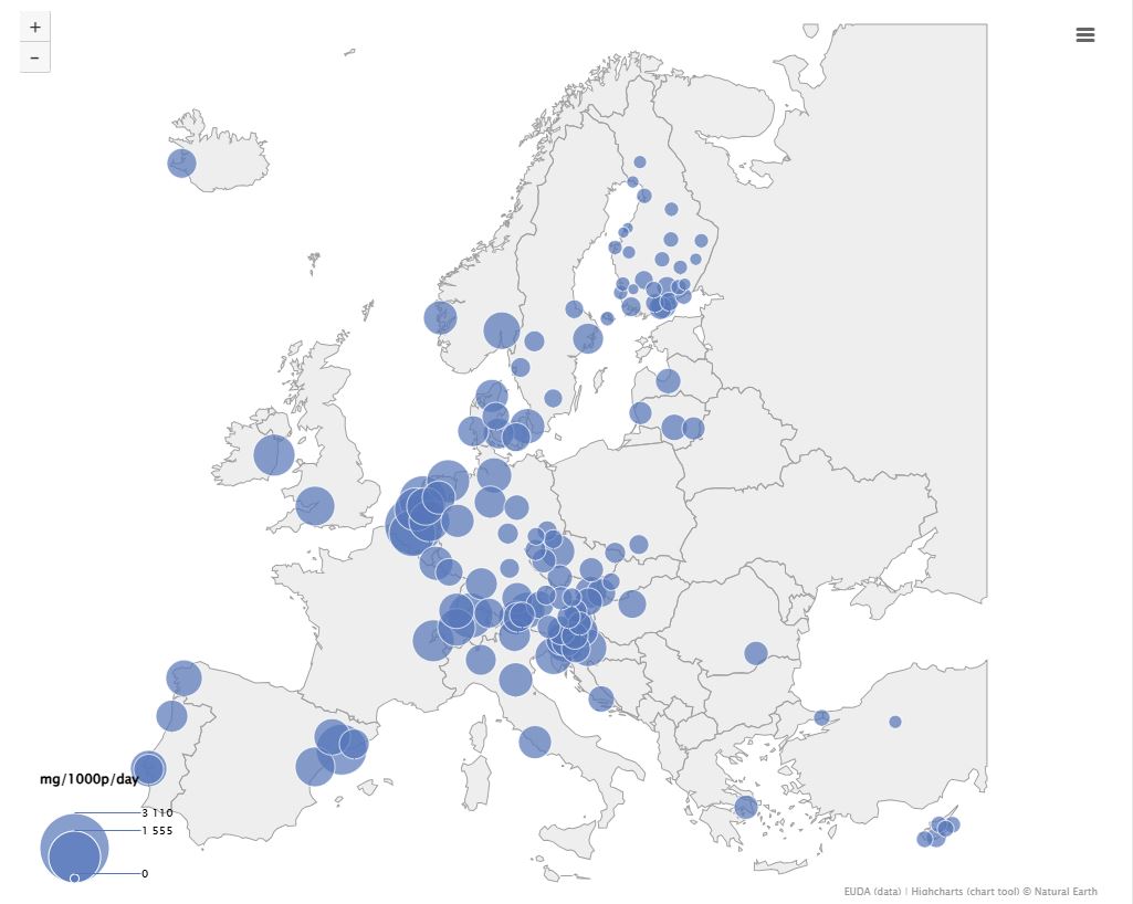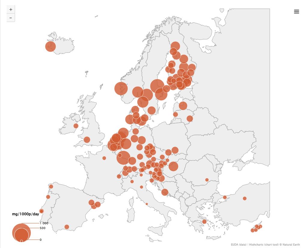 Τα υψηλότερα μαζικά φορτία MDMA (μεθυλαινοδιοξυμεθαμφεταμίνης) βρέθηκαν στα λύματα σε πόλεις του Βελγίου, της Τσεχίας, των Κάτω Χωρών και της Πορτογαλίας. Όπου υπάρχουν διαθέσιμα στοιχεία, κατά τη σύγκριση με τις τοποθεσίες μελέτης εκτός της Ευρωπαϊκής Ένωσης, μόνο οι πόλεις της Νέας Ζηλανδίας παρουσιάζουν παρόμοια επίπεδα χρήσης με τις πόλεις της Ευρώπης με τα υψηλότερα φορτία, ενώ όλες οι άλλες τοποθεσίες παρουσιάζουν χαμηλά επίπεδα χρήσης MDMA.