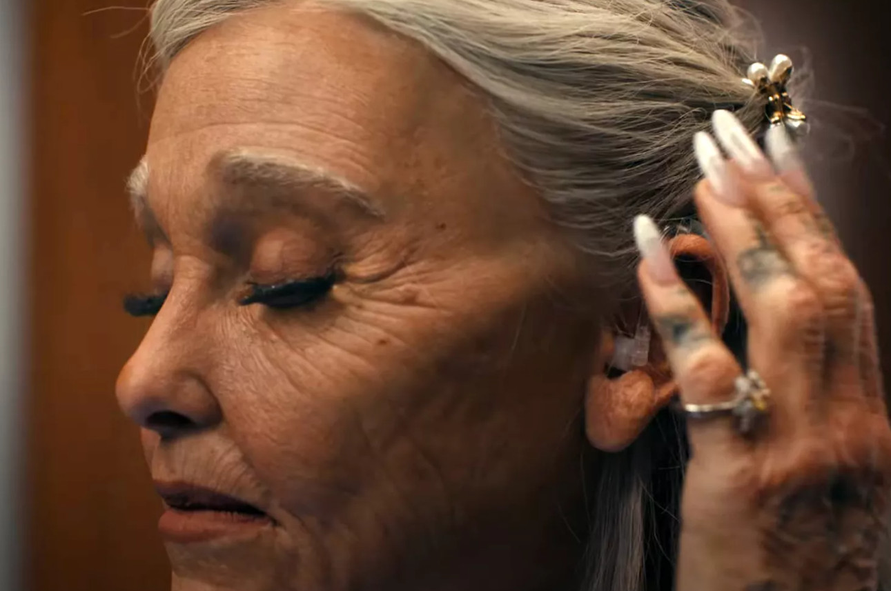 Η ποπ σταρ μεταμορφώθηκε με τη βοήθεια του μέικ απ «γερνώντας» το πρόσωπο και το σώμα της ως ο μεγαλύτερος εαυτός της fictional ηρωίδας της.
