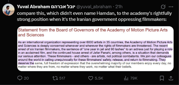 Ο Αβραάμ επέκρινε τη δήλωση στα μέσα κοινωνικής δικτύωσης: «Μετά την κριτική μας, οι ηγέτες της Ακαδημίας έστειλαν αυτό το μήνυμα ηλεκτρονικού ταχυδρομείου στα μέλη εξηγώντας τη σιωπή τους σχετικά με την επίθεση του Χαμντάν: πρέπει να σεβαστούν τις ‘μοναδικές απόψεις’», έγραψε στο X. Συνέκρινε τα σχόλια με μια «δικαίως ισχυρή» δήλωση που έκανε η Ακαδημία το 2011, όταν ο οργανισμός καταδίκασε τη σύλληψη έξι Ιρανών κινηματογραφιστών από την ιρανική κυβέρνηση, μεταξύ των οποίων και ο σκηνοθέτης Τζαφάρ Παναχί.
