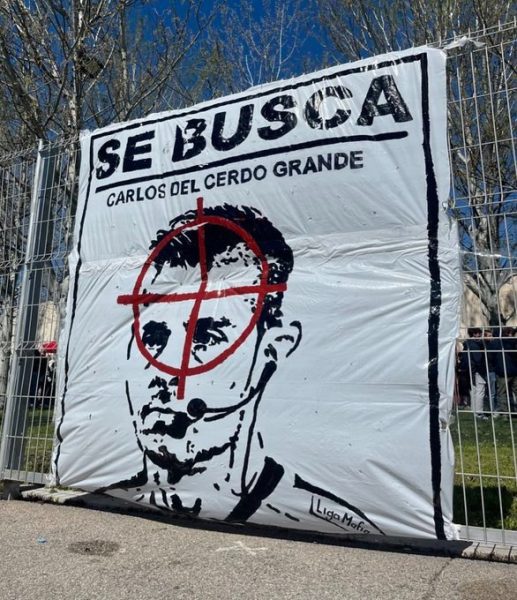 Για την ακρίβεια, το τεράστιο πανό που ανάρτησαν οι οπαδοί της Εσπανιόλ ανέφερε με μεγάλα γράμματα «SE BUSCA CARLOS DEL CERDO GRANDE». Αυτό μεταφράζεται ως «Σε ψάχνουμε Κάρλος ντελ… Γουρούνι Γκράντε». Με τους οπαδούς των Καταλανών να αλλάζουν το «Cerro» με το «Cedro», που σημαίνει γουρούνι! Μάλιστα, στο κάτω μέρος του πανό υπήρχε και το μήνυνα «Liga Mafia», με τη διαμαρτυρία να αφορά και τις αποφάσεις της διοργανώτριας αρχής του πρωταθλήματος.