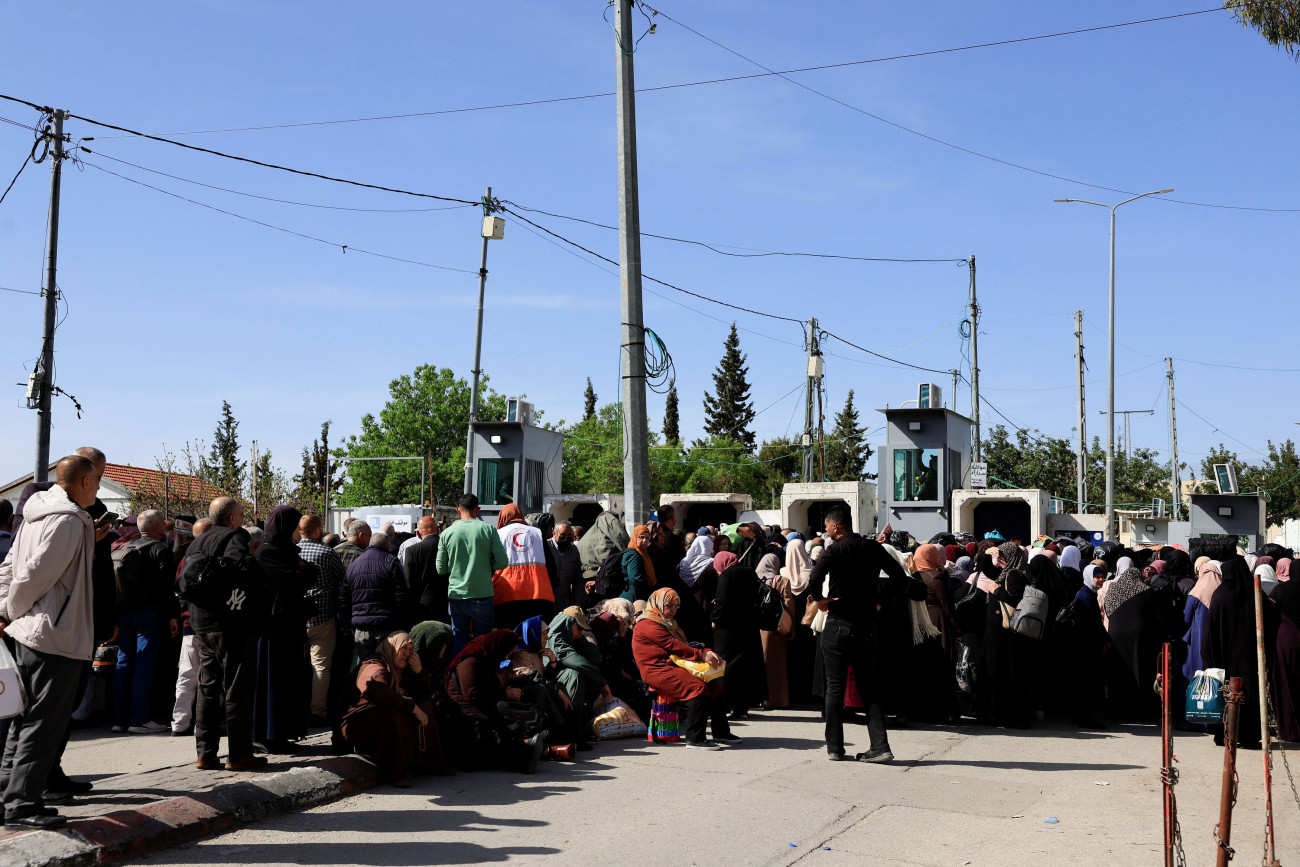 Παλαιστίνιοι περιμένουν σε ισραηλινό σημείο ελέγχου στη Βηθλεέμ, ώστε να μεταβούν στο Τέμενος του Άλ Άκσα.
