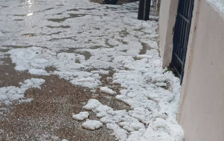 Μάλιστα στα λευκά «ντύθηκαν» οι δρόμοι στην Κώμη της Χίου από την έντονη χαλαζόπτωση που εκδηλώθηκε τη Δευτέρα.