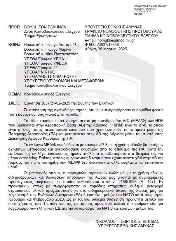 Ο Νίκος Δένδιας στην έγγραφη απάντηση του προς τους βουλευτές του ΚΚΕ σημειώνει ότι «ουδεμία συσχέτιση προκύπτει μεταξύ του δυστυχήματος των Τεμπών και της μεταφοράς αμυντικού υλικού ή καυσίμων είτε για λογαριασμό των ελληνικών Ενόπλων Δυνάμεων είτε για λογαριασμό του ΝΑΤΟ και κρατών – μελών του».