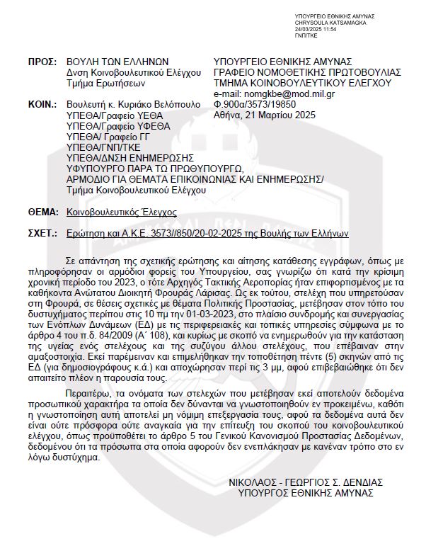 «Όπως με πληροφόρησαν οι αρμόδιοι φορείς του υπουργείου, σας γνωρίζω ότι κατά την κρίσιμη χρονική περίοδο του 2023, ο τότε Αρχηγός Τακτικής Αεροπορίας ήταν επιφορτισμένος με τα καθήκοντα Ανώτατου Διοικητή Φρουράς Λάρισας. Ως εκ τούτου, στελέχη που υπηρετούσαν στη Φρουρά, σε θέσεις σχετικές με θέματα Πολιτικής Προστασίας, μετέβησαν στον τόπο του δυστυχήματος περίπου στις 10 πμ την 01-03-2023, στο πλαίσιο συνδρομής και συνεργασίας των Ενόπλων Δυνάμεων (ΕΔ) με τις περιφερειακές και τοπικές υπηρεσίες σύμφωνα με το άρθρο 4 του π.δ. 84/2009 (Α΄ 108), και κυρίως με σκοπό να ενημερωθούν για την κατάσταση της υγείας ενός στελέχους και της συζύγου άλλου στελέχους, που επέβαιναν στην αμαξοστοιχία. Εκεί παρέμειναν και επιμελήθηκαν την τοποθέτηση πέντε (5) σκηνών από τις ΕΔ (για δημοσιογράφους κ.ά.) και αποχώρησαν περί τις 3 μμ, αφού επιβεβαιώθηκε ότι δεν απαιτείτο πλέον η παρουσία τους».
